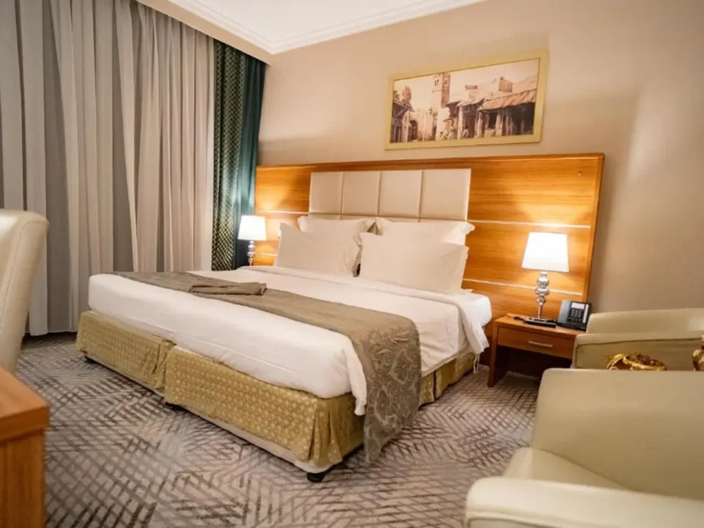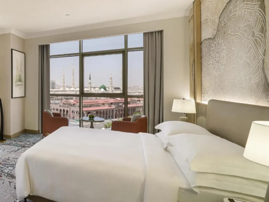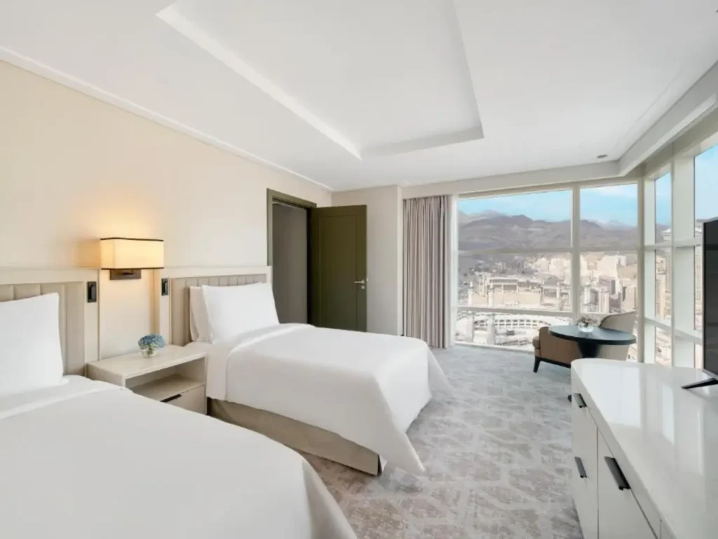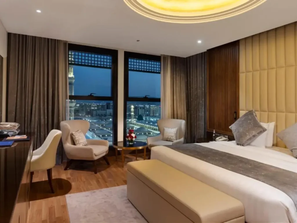Close to Haram, premium bedding, 24/7 room service, quiet lifts at busy times. Save energy for ibadah. View 5 star Umrah packages.